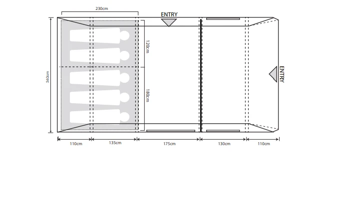 - 230cm deep, darkened Twilight micro polyester 5 person bedrooms with a 2/3 zip in divider