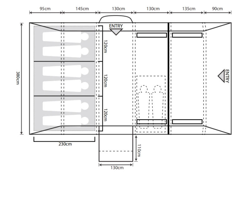 Each of the three bedrooms across the rear of the tunnel tent is separated by zipped dividers and comfortably accommodates two average adults, or a double air mattress, offering ample room for the whole family to enjoy.
