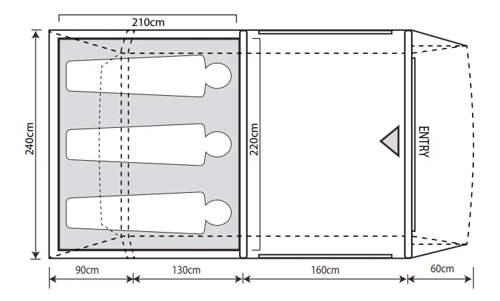 The breathable three-berth inner tent included can be clipped in to provide a luxurious sleeping area, designed to accommodate up to three average size adults. This is created using our darkened grey ‘twilight’ fabric, in order to cut down on exterior light and help you attain a deep, cosy and uninterrupted night’s sleep. This model utilises our bedroom ventilation system to maintain a comfortable sleeping environment by optimising airflow, whilst helping combat condensation and internal humidity.