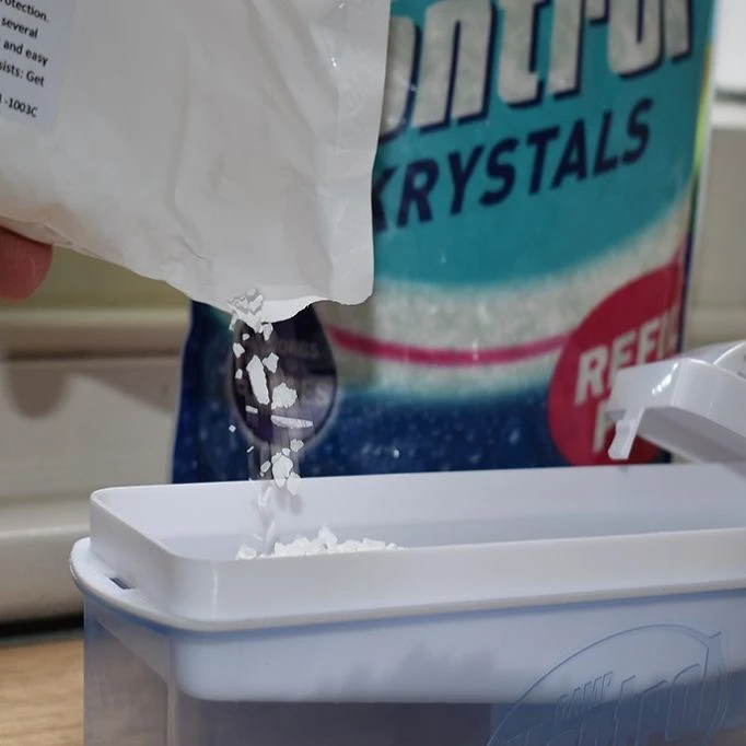 Kontrol Crystals Anhydrous flakes of calcium chloride CaCI have a high affinity to water and readily attract excess humidity from the air through a simple chemical process.