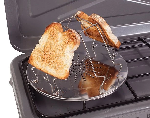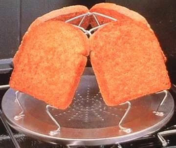 This 4 Slice Folding Toaster has a circular steel plate with four folding wire struts supporting grips that can hold up to four small bread slices.